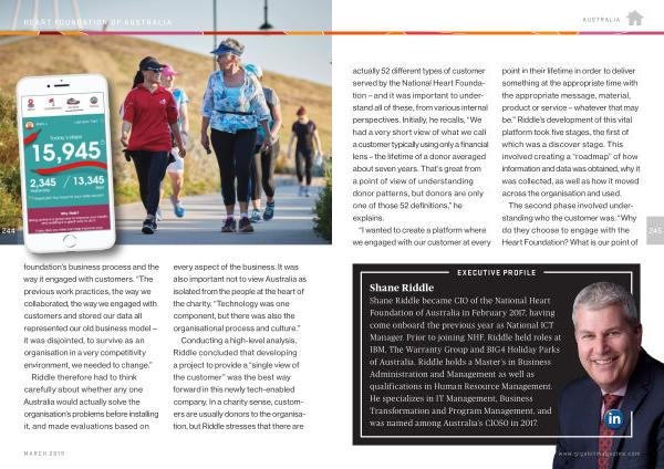Shane Riddle became CIO of the National Heart Foundation of Australia in February 2017 , having come onboard the previous year as National ICT Manager . Prior to joining NHF , Riddle held roles at IBM , The Warranty Group and BIG4 Holiday Parks of Australia . Riddle holds a Master ’ s in Business Administration and Management as well as qualifications in Human Resource Management . He specializes in IT Management , Business Transformation and Program Management , and was named among Australia ’ s CIO50 in 2017 .