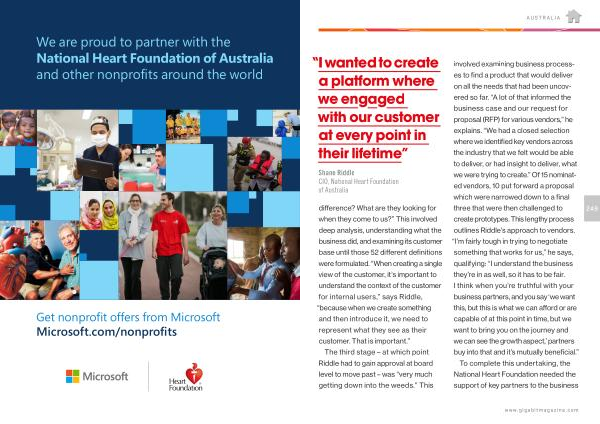 The third stage – at which point Riddle had to gain approval at board level to move past – was “ very much getting down into the weeds .” This involved examining business processes to find a product that would deliver on all the needs that had been uncovered so far . “ A lot of that informed the business case and our request for proposal ( RFP ) for various vendors ,” he explains . “ We had a closed selection where we identified key vendors across the industry that we felt would be able to deliver , or had insight to deliver , what we were trying to create .” Of 15 nominated vendors , 10 put forward a proposal which were narrowed down to a final three that were then challenged to create prototypes . This lengthy process outlines Riddle ’ s approach to vendors . “ I ’ m fairly tough in trying to negotiate something that works for us ,” he says , qualifying : “ I understand the business they ’ re in as well , so it has to be fair . I think when you ’ re truthful with your business partners , and you say ‘ we want this , but this is what we can afford or are capable of at this point in time , but we want to bring you on the journey and we can see the growth aspect ,’ partners buy into that and it ’ s mutually beneficial .” To complete this undertaking , the National Heart Foundation needed the support of key partners to the business