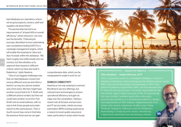 EXECUTIVE PROFILE Clive Hawkins | Senior Director of IT After a successful career as a Developer building a variety of solutions ( including a sports package for the Mediterranean Games 1991 ), Clive moved into project management in 1992 . Clive joined Wyndham in September 2006 , and has managed the IT Team for the past 10 years . Currently responsible for the Asia Pacific region . Major successes of the IT team during this time include : Seamless head office relocation , introducing Salesforce as a development platform , design and implantation of DNC solution , implementation of an online sales system , expansion of offices into China , Thailand , Singapore , Indonesia and the Philippines , maintaining a strong security stance , introducing a digitalized automated loan decisioning solution .