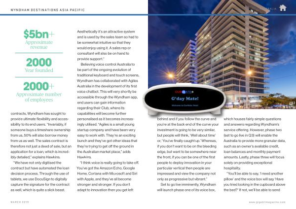 Believing voice control Australia to be part of the ongoing evolution of traditional keyboard and touch screens , Wyndham has collaborated with Agiles Australia in the development of its first voice chatbot . This will very shortly be accessible through the Wyndham app , end users can gain information regarding their Club , where its capabilities will become further personalised as it becomes increasingly utilised . “ Agiles is a small young startup company and have been very easy to work with . They ’ re an exciting bunch and they ’ ve got other ideas that they ’ re trying to get off the ground in the Australian market place ,” adds Hawkins .
