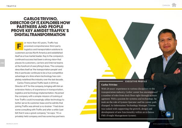 With 28 years ’ experience in various disciplines in the transportation industry , Carlos ’ career has encompassed a number of roles from dock floor right through to management . With a passion for systems and technology , he took on the role of System Operator and his career path changed . As Information Technology Manager , Trivino was tasked with supporting the growth , design and development of new functionality within an in-house FMS ( Freight Management System ).