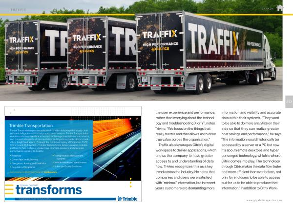 Traffix also leverages Citrix ’ s digital workspace to deliver applications , which allows the company to have greater access to and understanding of data flow . Trivino recognizes this as a key trend across the industry . He notes that companies and users were satisfied with “ minimal ” information , but in recent years customers are demanding more information and visibility and accurate data within their systems . “ They want to be able to do more analytics on their side so that they can realize greater cost savings and performance ,” he says . “ The information would historically be accessed by a server or a PC but now it ’ s about remote desktops and hyper converged technology , which is where Citrix comes into play . The technology through Citrix makes the data flow faster and more efficient than ever before , not only for end users to be able to access but for us to be able to produce that information .” In addition to Citrix Work-