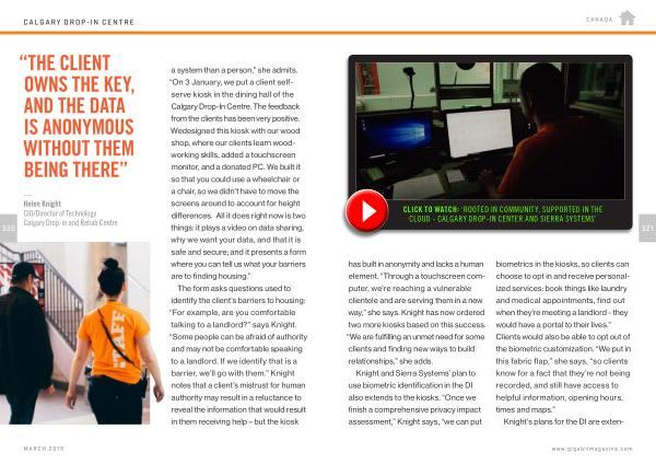 — Helen Knight CIO / Director of Technology Calgary Drop-in and Rehab Centre a system than a person ,” she admits . “ On 3 January , we put a client selfserve kiosk in the dining hall of the Calgary Drop-In Centre . The feedback from the clients has been very positive . Wedesigned this kiosk with our wood shop , where our clients learn woodworking skills , added a touchscreen monitor , and a donated PC . We built it so that you could use a wheelchair or a chair , so we didn ’ t have to move the screens around to account for height differences . All it does right now is two things : it plays a video on data sharing , why we want your data , and that it is safe and secure ; and it presents a form where you can tell us what your barriers are to finding housing .”