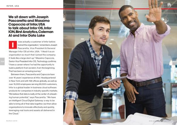 I was actually a customer of Infor before I joined the organization ,” remembers Joseph Pascaretta , Vice President & General Manager Infor OS at Infor , USA . “ I liked it as an organization so much that I joined the company . It feels like a large start-up .” Massimo Capoccia , Senior Vice President Infor OS , Technology confirms : “ I have a career where I ’ ve had the opportunity to build a platform from scratch , from the beginning . That has been an amazing journey .”