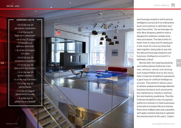 NORTH AMERICA and leverage analytics and business intelligence across all of an enterprise ’ s back-end systems is definitely key ,” says Pascaretta . “ So we leverage our Infor Birst Analytics platform that is designed to optimize complex business processes . The idea is that it ’ s faster time to value and it ’ s deployed in the cloud . So once you have that data together , being able to see into the data and leverage analytics and business intelligence around it is definitely critical .”