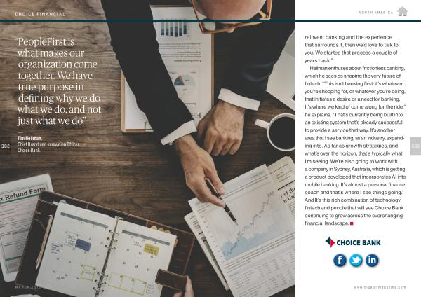 Heilman enthuses about frictionless banking , which he sees as shaping the very future of fintech . “ This isn ’ t banking first : it ’ s whatever you ’ re shopping for , or whatever you ’ re doing , that initiates a desire or a need for banking . It ’ s where we kind of come along for the ride ,” he explains . “ That ’ s currently being built into an existing system that ’ s already successful to provide a service that way . It ’ s another area that I see banking , as an industry , expanding into . As far as growth strategies , and what ’ s over the horizon , that ’ s typically what I ’ m seeing . We ’ re also going to work with a company in Sydney , Australia , which is getting a product developed that incorporates AI into mobile banking . It ’ s almost a personal finance coach and that ’ s where I see things going .” And It ’ s this rich combination of technology , fintech and people that will see Choice Bank continuing to grow across the everchanging financial landscape .