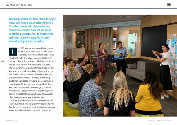 Auckland ’ s Watercare , New Zealand ’ s largest water utility company , provides the city ’ s 1.7 million people with clean water and reliable wastewater disposal . We spoke to Rebecca Chenery , Paul du Quaasteniet , and Peter Johnston about Watercare ’ s innovative digital transformation