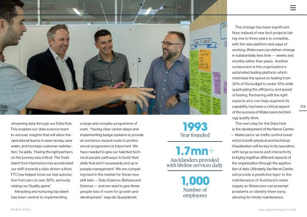 The next step for the Data Hub is the development of the Nerve Centre — Watercare ’ s ‘ air traffic control tower ’ which is both physical and technical . Visualisation will be key to its operation , with large screens and interactivity bringing together different aspects of the organisation through the application of data . Ultimately , the Nerve Centre will provide a predictive layer to the maintenance of Auckland ’ s water supply so Watercare can preempt problems or identify them early , allowing for timely maintenance .