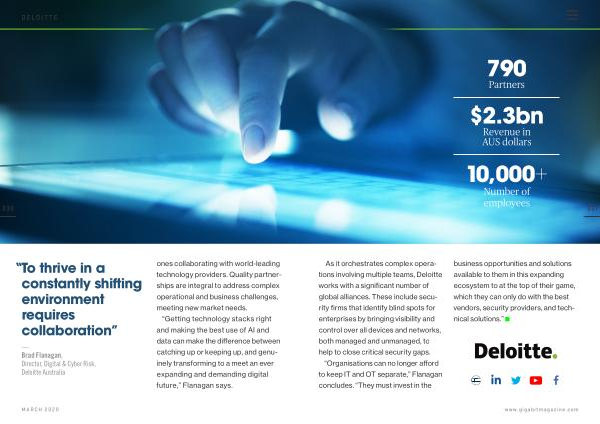 — Brad Flanagan , Director , Digital & Cyber Risk , Deloitte Australia ones collaborating with world-leading technology providers . Quality partnerships are integral to address complex operational and business challenges , meeting new market needs .