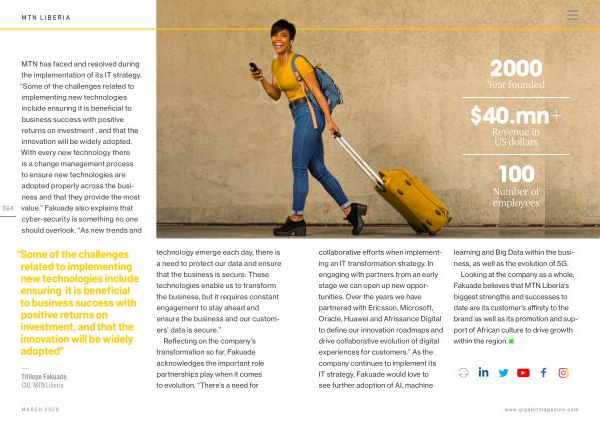 — Titilope Fakuade , CIO , MTN Liberia technology emerge each day , there is a need to protect our data and ensure that the business is secure . These technologies enable us to transform the business , but it requires constant engagement to stay ahead and ensure the business and our customers ’ data is secure .”