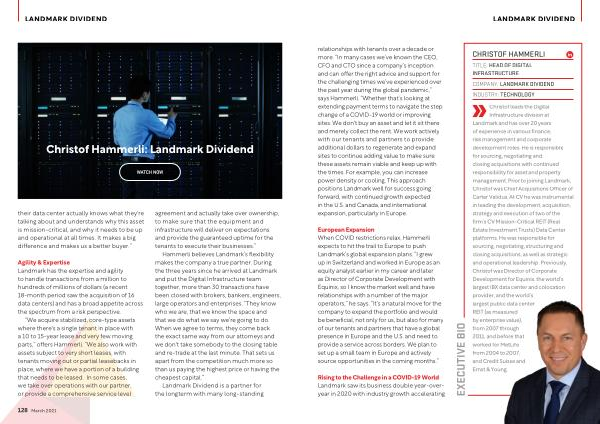 LANDMARK DIVIDEND relationships with tenants over a decade or more . “ In many cases we ’ ve known the CEO , CFO and CTO since a company ’ s inception and can offer the right advice and support for the challenging times we ’ ve experienced over the past year during the global pandemic ,” says Hammerli . “ Whether that ’ s looking at extending payment terms to navigate the step change of a COVID-19 world or improving sites . We don ' t buy an asset and let it sit there and merely collect the rent . We work actively with our tenants and partners to provide additional dollars to regenerate and expand sites to continue adding value to make sure these assets remain viable and keep up with the times . For example , you can increase power density or cooling . This approach positions Landmark well for success going forward , with continued growth expected in the U . S . and Canada , and international expansion , particularly in Europe . European Expansion When COVID restrictions relax , Hammerli expects to hit the trail to Europe to push Landmark ’ s global expansion plans . “ I grew up in Switzerland and worked in Europe as an equity analyst earlier in my career and later as Director of Corporate Development with Equinix , so I know the market well and have relationships with a number of the major operators ,” he says . “ It ’ s a natural move for the company to expand the portfolio and would be beneficial , not only for us , but also for many of our tenants and partners that have a global presence in Europe and the U . S . and need to provide a service across borders . We plan to set up a small team in Europe and actively source opportunities in the coming months .”