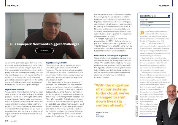 Rapid Discovery with IBM Digital transformation has been a major undertaking for the IT department at Newmont . “ The partnership with vendors like IBM , supports our work to consolidate our systems and further realize the synergies we have across the business since the acquisition of Goldcorp in 2019 .”