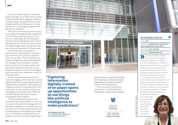 Another key development will be in medical imaging , as the Trust has recently signed a deal with Siemens Healthineers to upgrade their equipment . “ Demand for our imaging services is increasing by 5 % -10 % every year , yet we ’ ve had to reduce our throughput to deal safely with COVID-19 ,” Catherine Walsh , Divisional Director of Imaging for MFT explains .