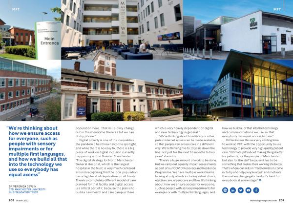 Dr Devlin sees this as a very exciting time to work at MFT , with the opportunity to use technology to provide very high quality patient care . " Ultimately it ' s about making things better for patients , for the people of Manchester , but also for the staff because it has to be something that makes their working life better . That ' s where our skills in Transformation come in , to try and help people adjust and motivate them when change gets hard - it ' s hard for everybody at some stage ."