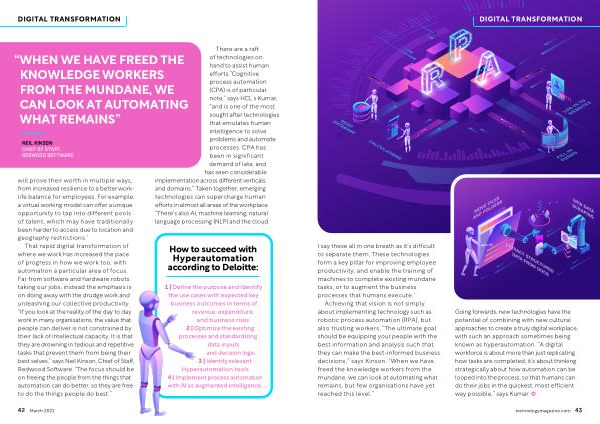 Going forwards , new technologies have the potential of combining with new cultural approaches to create a truly digital workplace , with such an approach sometimes being known as hyperautomation . “ A digital workforce is about more than just replicating how tasks are completed ; it ’ s about thinking strategically about how automation can be looped into the process , so that humans can do their jobs in the quickest , most efficient way possible ,” says Kumar .