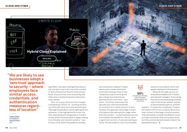 CLOUD AND CYBER the investments made by IT teams seems sure to mean some level of remote working is here to stay . “ Ubiquitous hybrid working will also change how networks are delivered and consumed ,” says Kiehn . “ Currently , businesses will typically buy network bandwidth for a location for a certain amount . In time , however , this approach will change so that it is focused on the users and the usage rather than the location – so that businesses are not committed to bandwidth for offices , when a significant portion of users are working at home . This will make for much more flexible