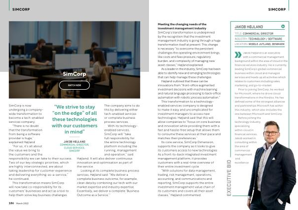 This transformation to a technologyenabled services company is designed to make it easy and uncomplicated for investment managers to access new technologies . Højland said that this will allow companies to “ focus on core business and innovation while providing them with a fast and hassle-free setup that allows them to consume these services at their pace and matches their preferences .”