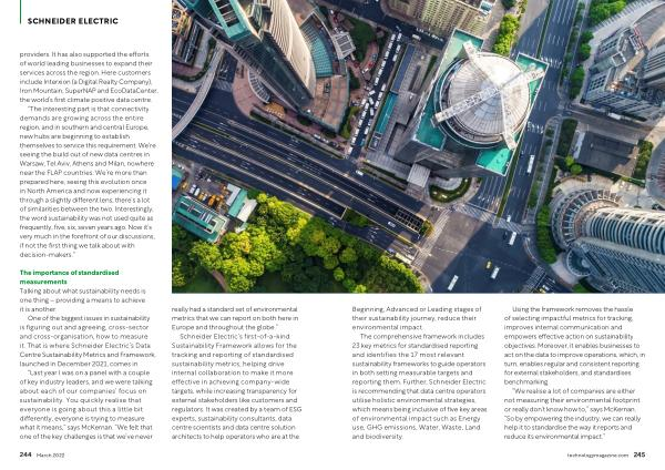 The comprehensive framework includes 23 key metrics for standardised reporting and identifies the 17 most relevant sustainability frameworks to guide operators in both setting measurable targets and reporting them . Further , Schneider Electric is recommending that data centre operators utilise holistic environmental strategies , which means being inclusive of five key areas of environmental impact such as Energy use , GHG emissions , Water , Waste , Land and biodiversity .