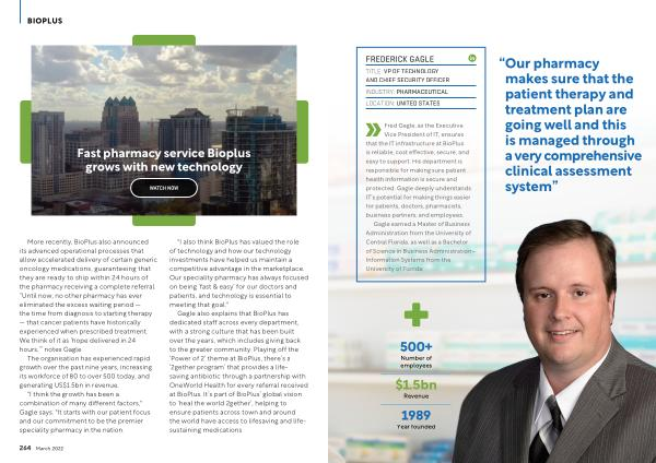" I also think BioPlus has valued the role of technology and how our technology investments have helped us maintain a competitive advantage in the marketplace . Our speciality pharmacy has always focused on being ‘ fast & easy ’ for our doctors and patients , and technology is essential to meeting that goal ."