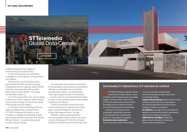 It will also be among the most sustainable , supporting customers in meeting their own sustainability ambitions . Among green highlights : Embodied carbon reductions : Use of innovative solutions like hollow core concrete slabs , recycled steel and HDPE3 piping will lead to reductions in embodied carbon . Liquid cooling readiness : Deliver liquid-cooled solutions and servers to not only support AI-powered applications , but also reduce energy and water consumption . AI readiness : Leverage AI , ML and advanced analytics to improve the facility ’ s operational efficiency and optimise energy use . LEED Gold Pre-Certified : Designed to global industry standards , Fairview has LEED Gold Pre-Certification .