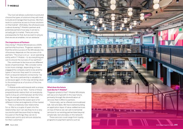 The Importance of Partners Describing T-Mobile Wholesale as a 100 % partnership business , Thygesen explains that the entire success of the Wholesale line of business depends on the success of its partners . “ The onus is on us – as an operating entity within T-Mobile – to do everything we can to ensure the success of our partners .”
