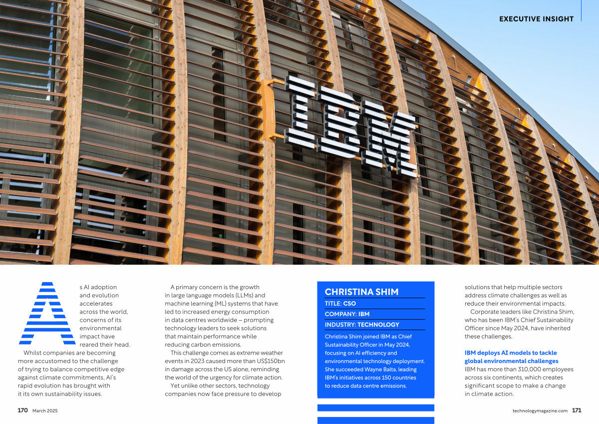 Christina Shim joined IBM as Chief Sustainability Officer in May 2024 , focusing on AI efficiency and environmental technology deployment . She succeeded Wayne Balta , leading IBM ’ s initiatives across 150 countries to reduce data centre emissions . solutions that help multiple sectors address climate challenges as well as reduce their environmental impacts .