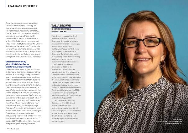 Graceland University joins HESS Collective for Oracle Cloud deployment The HESS Collective – Higher Education Systems and Solutions – does something unusual in technology. Competitors talk openly about processes, share solutions and collaborate in ways that would be unthinkable in most industries. Each member institution implements the same Oracle Cloud system, which means a report Talia creates in her instance can be shared directly with another university in Iowa or across the country.“ We’ re able to collaborate and engage with each other in ways that you typically don’ t see in other industries, where you’ re talking to your competitors about how they do things,” Talia says. The model works because small private institutions face similar challenges. They serve comparable student populations, operate with similar resource constraints and need systems that can handle both traditional campus students and growing online programmes.