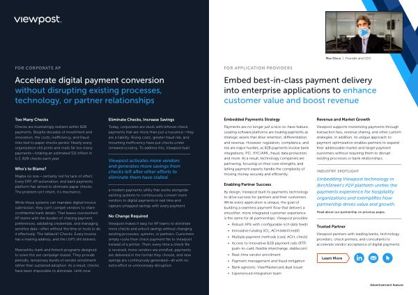 Viewpost makes it easy for AP teams to eliminate more checks and unlock savings without changing existing processes, systems, or partners. Customers simply route their check payment file to Viewpost instead of a printer. Then, every time a check file is received, more vendors are enrolled, payments are delivered in the format they choose, and new savings are continuously generated— all with no extra effort or unnecessary disruption.