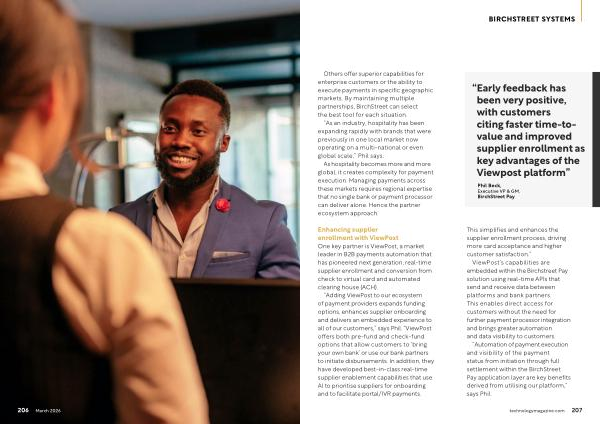 “ Automation of payment execution and visibility of the payment status from initiation through full settlement within the BirchStreet Pay application layer are key benefits derived from utilising our platform,” says Phil. technologymagazine. com