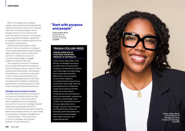 Trasha Collins-Reed, MBA, is the Director of Strategic Sourcing at SiriusXM, where she directs the company’ s comprehensive Product and Technology sourcing strategy. She oversees approximately $ 800 million in annual spend across critical categories including Enterprise Applications, Automotive Technology, MarTech, and Cybersecurity. A seasoned supply chain and procurement leader, Ms. Collins-Reed is recognized for driving enterprisewide cost optimization, operational excellence, and strategic value creation. Her distinguished career includes leadership roles at Google, The Coca-Cola Company, and Newell Brands, where she built high-performing teams and advanced sourcing strategies that enable innovation and sustainable growth.