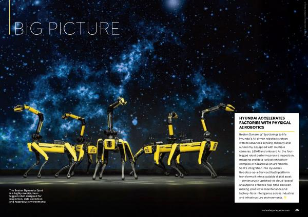 Boston Dynamics’ Spot brings to life Hyundai’ s AI-driven robotics strategy with its advanced sensing, mobility and autonomy. Equipped with multiple cameras, LiDAR and onboard AI, the fourlegged robot performs precise inspection, mapping and data-collection tasks in complex or hazardous environments. Spot’ s integration into Hyundai’ s Robotics‐as‐a‐Service( RaaS) platform transforms it into a scalable digital asset – continuously updated via cloud-based analytics to enhance real-time decisionmaking, predictive maintenance and factory-floor intelligence across industrial and infrastructure environments.