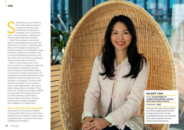Hilary Tam has spent more than 15 years in sustainability and has watched the function move from“ doing the right thing” at the margins to shaping core business strategy. As Sustainability Leader for Amazon Web Services( AWS) across Europe, the Middle East and Africa, she now works with customers to accelerate their journeys using cloud and AI.