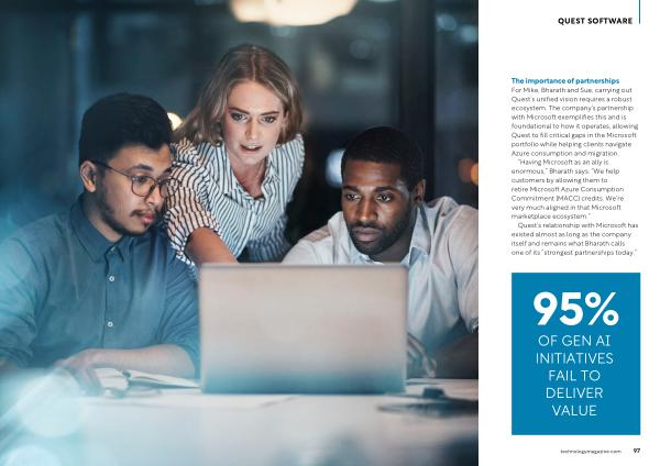 The importance of partnerships For Mike, Bharath and Sue, carrying out Quest’ s unified vision requires a robust ecosystem. The company’ s partnership with Microsoft exemplifies this and is foundational to how it operates, allowing Quest to fill critical gaps in the Microsoft portfolio while helping clients navigate Azure consumption and migration.“ Having Microsoft as an ally is enormous,” Bharath says.“ We help customers by allowing them to retire Microsoft Azure Consumption Commitment( MACC) credits. We’ re very much aligned in that Microsoft marketplace ecosystem.”