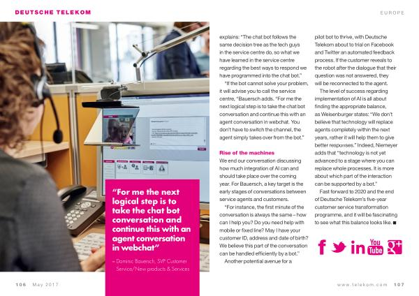 Fast forward to 2020 and the end of Deutsche Telekom ’ s five-year customer service transformation programme , and it will be fascinating to see what this balance looks like . www . telekom . com 107