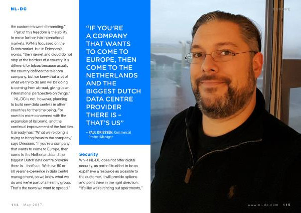 NL-DC is not , however , planning to build new data centres in other countries for the time being . For now it is more concerned with the expansion of its brand , and the continual improvement of the facilities it already has : “ What we ’ re doing is trying to bring focus to the company ,” says Driessen . “ If you ’ re a company that wants to come to Europe , then come to the Netherlands and the biggest Dutch data centre provider there is – that ’ s us . We have 50 or 60 years ’ experience in data centre management , so we know what we do and we ’ re part of a healthy group . That ’ s the news we want to spread .”