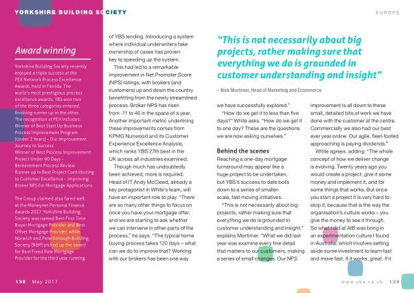 Yorkshire Building Society recently enjoyed a triple success at the PEX Network Process Excellence Awards , held in Florida . The world ’ s most prestigious process excellence awards , YBS won two of the three categories entered , finishing runner up in the other . The recognition at PEX includes : Winner of Best Start Up Business Process Improvement Program ( Under 2 Years ) – Our Improvement Journey to Success Winner of Best Process Improvement Project Under 90 Days - Bereavement Process Review Runner up in Best Project Contributing to Customer Excellence - Improving Broker NPS for Mortgage Applications