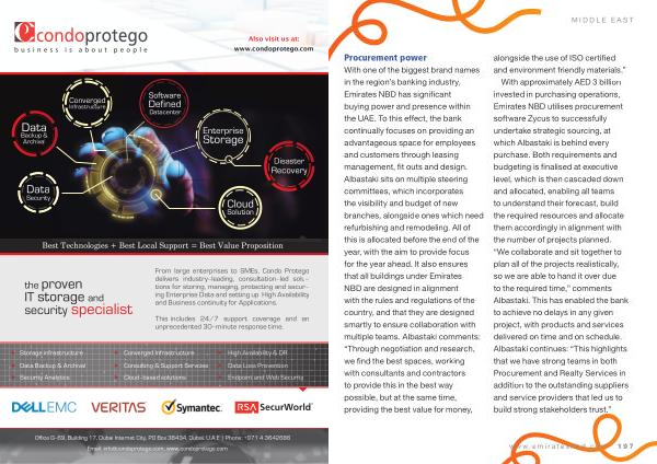 With one of the biggest brand names in the region ’ s banking industry , Emirates NBD has significant buying power and presence within the UAE . To this effect , the bank continually focuses on providing an advantageous space for employees and customers through leasing management , fit outs and design . Albastaki sits on multiple steering committees , which incorporates the visibility and budget of new branches , alongside ones which need refurbishing and remodeling . All of this is allocated before the end of the year , with the aim to provide focus for the year ahead . It also ensures that all buildings under Emirates NBD are designed in alignment with the rules and regulations of the country , and that they are designed smartly to ensure collaboration with multiple teams . Albastaki comments : “ Through negotiation and research , we find the best spaces , working with consultants and contractors to provide this in the best way possible , but at the same time , providing the best value for money , alongside the use of ISO certified and environment friendly materials .”