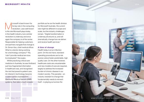 Whilst practicing critical care medicine in Australia , he saw firsthand just how fragmented information in healthcare was , and recognised the risk that posed to patient care . An interest in technology became a career as Kos explored first Electronic Medical Record ( EMR ) systems , then later a much broader portfolio as he ran the health division for Microsoft Australia . His current role might be different in scope and scale , but the industry challenges remain . “ Digital transformation is underway all around us , and will dramatically change how we deliver and receive health services .”