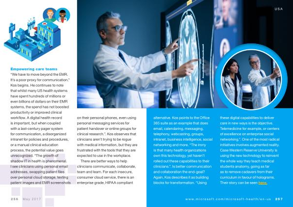 USA alternative . Kos points to the Office 365 suite as an example that does email , calendaring , messaging , telephony , webcasting , groups , intranet , business intelligence , social networking and more . “ The irony is that many health organizations own this technology , yet haven ’ t rolled out these capabilities to their clinicians .”. Is better communication and collaboration the end-goal ? Again , Kos describes it as building blocks for transformation . “ Using these digital capabilities to deliver care in new ways is the objective . Telemedicine for example , or centers of excellence on enterprise social networking .”. One of the most radical initiatives involves augmented reality . Case Western Reserve University is using the new technology to reinvent the whole way they teach medical students anatomy , going as far as to remove cadavers from their curriculum in favour of holograms . Their story can be seen here .