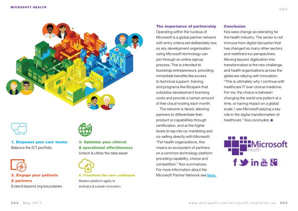 Conclusion Kos sees change accelerating for the health industry . The sector is not immune from digital disruption that has changed so many other sectors and redefined our perspectives . Moving beyond digitization into transformation is the new challenge , and health organizations across the globe are rallying with innovation . “ This is ultimately why I continue with healthcare IT over clinical medicine . For me , the choice is between changing the world one patient at a time , or having impact on a global scale . I see Microsoft playing a key role in the digital transformation of healthcare .” Kos concludes .
