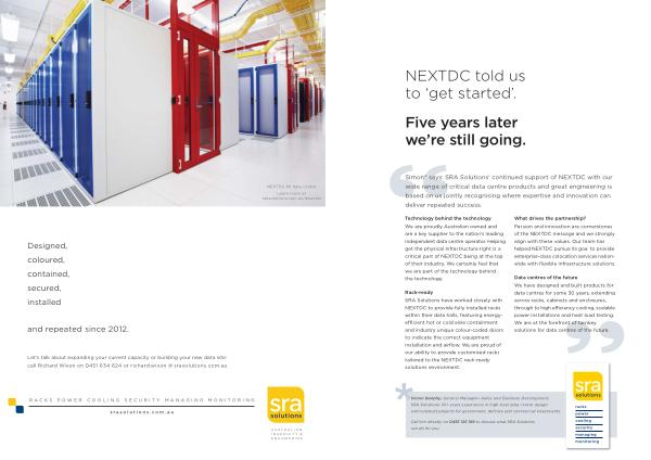 Rack-ready SRA Solutions have worked closely with NEXTDC to provide fully installed racks within their data halls , featuring energyefficient hot or cold aisle containment and industry unique colour-coded doors to indicate the correct equipment installation and airflow . We are proud of our ability to provide customised racks tailored to the NEXTDC rack-ready solutions environment .