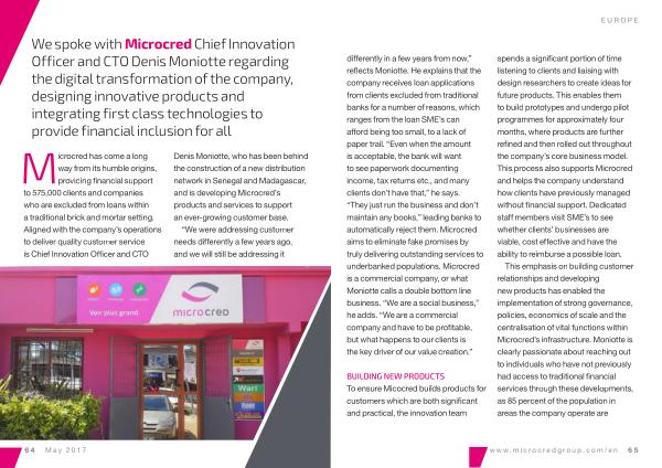 EUROPE differently in a few years from now ,” reflects Moniotte . He explains that the company receives loan applications from clients excluded from traditional banks for a number of reasons , which ranges from the loan SME ’ s can afford being too small , to a lack of paper trail . “ Even when the amount is acceptable , the bank will want to see paperwork documenting income , tax returns etc ., and many clients don ’ t have that ,” he says . “ They just run the business and don ’ t maintain any books ,” leading banks to automatically reject them . Microcred aims to eliminate fake promises by truly delivering outstanding services to underbanked populations . Microcred is a commercial company , or what Moniotte calls a double bottom line business . “ We are a social business ,” he adds . “ We are a commercial company and have to be profitable , but what happens to our clients is the key driver of our value creation .”