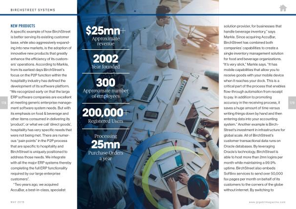 A specific example of how BirchStreet is better serving its existing customer base , while also aggressively expanding into new markets , is the adoption of innovative new products that greatly enhance the efficiency of its customers ’ operations . According to Markle , from its earliest days BirchStreet ’ s focus on the P2P function within the hospitality industry has defined the development of its software platform . “ We recognized early on that the large ERP software companies are excellent at meeting generic enterprise management software system needs . But with its emphasis on food & beverage and other items consumed in delivering its ‘ product ’, or what we call ‘ direct goods ’, hospitality has very specific needs that were not being met . There are numerous “ pain points ” in the P2P process that are specific to hospitality and BirchStreet is uniquely positioned to address those needs . We integrate with all the major ERP systems thereby completing the full ERP functionality required by our large enterprise customers ”.
