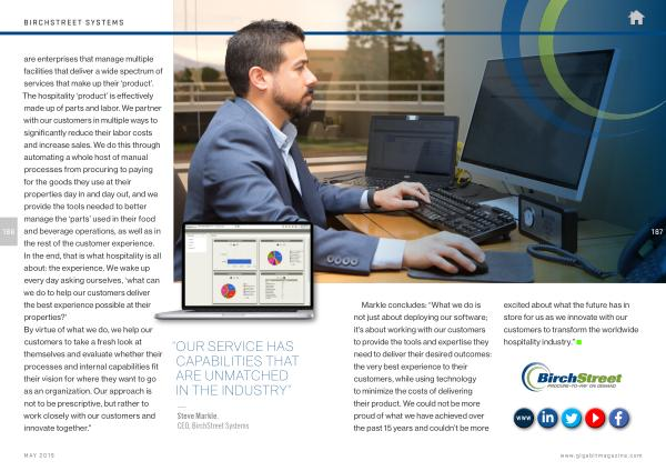 186 are enterprises that manage multiple facilities that deliver a wide spectrum of services that make up their ‘ product ’. The hospitality ‘ product ’ is effectively made up of parts and labor . We partner with our customers in multiple ways to significantly reduce their labor costs and increase sales . We do this through automating a whole host of manual processes from procuring to paying for the goods they use at their properties day in and day out , and we provide the tools needed to better manage the ‘ parts ’ used in their food and beverage operations , as well as in the rest of the customer experience . In the end , that is what hospitality is all about : the experience . We wake up every day asking ourselves , ‘ what can we do to help our customers deliver the best experience possible at their properties ?’ By virtue of what we do , we help our customers to take a fresh look at themselves and evaluate whether their processes and internal capabilities fit their vision for where they want to go as an organization . Our approach is not to be prescriptive , but rather to work closely with our customers and innovate together .”