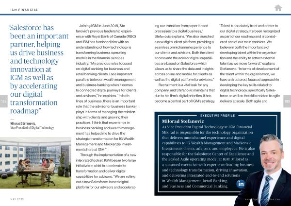 Joining IGM in June 2018 , Stefanovic ’ s previous leadership experience with Royal Bank of Canada ( RBC ) and IBM has furnished him with an understanding of how technology is transforming business operating models in the financial services industry . “ My previous roles focused on digital banking for business and retail banking clients . I see important parallels between wealth management and business banking when it comes to connected digital journeys for clients and advisors ,” he explains . “ In both lines of business , there is an important role that the advisor or business banker plays in terms of managing the relationship with clients and growing their practices . I think that experience in business banking and wealth management has helped me to drive the strategic transformation for IG Wealth Management and Mackenzie Investments here at IGM .”