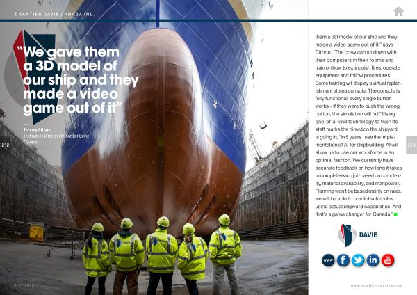 them a 3D model of our ship and they made a video game out of it ,” says Citone . “ The crew can sit down with their computers in their rooms and train on how to extinguish fires , operate equipment and follow procedures . Some training will display a virtual replenishment at sea console . The console is fully functional , every single button works – if they were to push the wrong button , the simulation will fail .” Using one-of-a-kind technology to train its staff marks the direction the shipyard is going in , “ In 5 years I see the implementation of AI for shipbuilding . AI will allow us to use our workforce in an optimal fashion . We currently have accurate feedback on how long it takes to complete each job based on complexity , material availability , and manpower . Planning won ’ t be based mainly on rules : we will be able to predict schedules using actual shipyard capabilities . And that ’ s a game changer for Canada .”