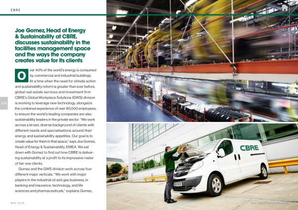 O ver 40 % of the world ’ s energy is consumed by commercial and industrial buildings . At a time when the need for climate action and sustainability reform is greater than ever before , global real estate services and investment firm CBRE ’ s Global Workplace Solutions ( GWS ) division is working to leverage new technology , alongside the combined experience of over 80,000 employees , to ensure the world ’ s leading companies are also sustainability leaders in the private sector . “ We work across a broad , diverse background of clients with different needs and specialisations around their energy and sustainability appetites . Our goal is to create value for them in that space ,” says Joe Gomez , Head of Energy & Sustainability , EMEA . We sat down with Gomez to find out how CBRE is delivering sustainability at a profit to its impressive roster of tier one clients .