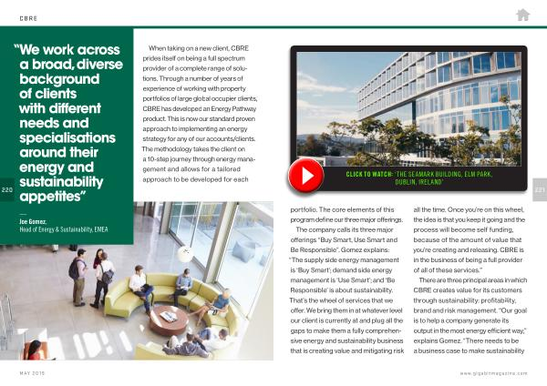 The company calls its three major offerings “ Buy Smart , Use Smart and Be Responsible ”. Gomez explains : “ The supply side energy management is ‘ Buy Smart ’; demand side energy management is ‘ Use Smart ’; and ‘ Be Responsible ’ is about sustainability . That ’ s the wheel of services that we offer . We bring them in at whatever level our client is currently at and plug all the gaps to make them a fully comprehensive energy and sustainability business that is creating value and mitigating risk all the time . Once you ’ re on this wheel , the idea is that you keep it going and the process will become self funding , because of the amount of value that you ’ re creating and releasing . CBRE is in the business of being a full provider of all of these services .”