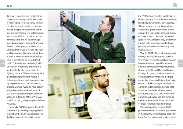 Thirdly , CBRE offers risk management through its sustainability expertise . “ The energy and sustainability landscape has experienced a proliferation of financial and legislative requirements , driven by the United Nations Climate Change Program to deliver a world to our grandchildren that ’ s 1.5 degrees cooler than if we don ’ t take action ,” notes Gomez . CBRE manages the risks of compliance for its customers so that “ whether they ’ re lending money or making Nurofen , we take away their compliance headaches and minimise their exposure to the financial impact of those regulations and penalties ”.