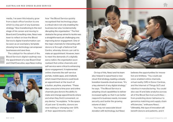 On top of this , Nesci and his team also helped to spearhead a new cloud-first strategy , leading a steady transition towards cloud services . “ It ’ s a key element of any digital strategy ,” he says . “ The Blood Service is adopting cloud capabilities to deliver increased agility so that it can better respond to business needs , increase security and tackle the growing volume of data .”